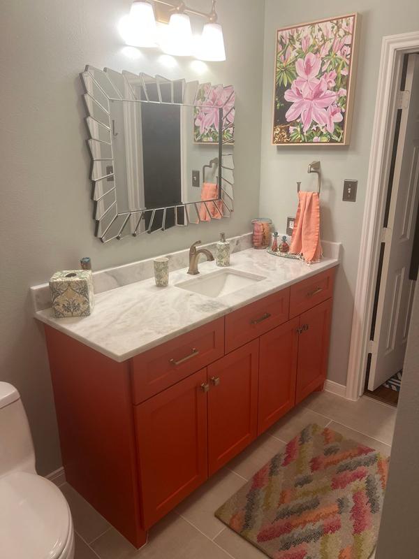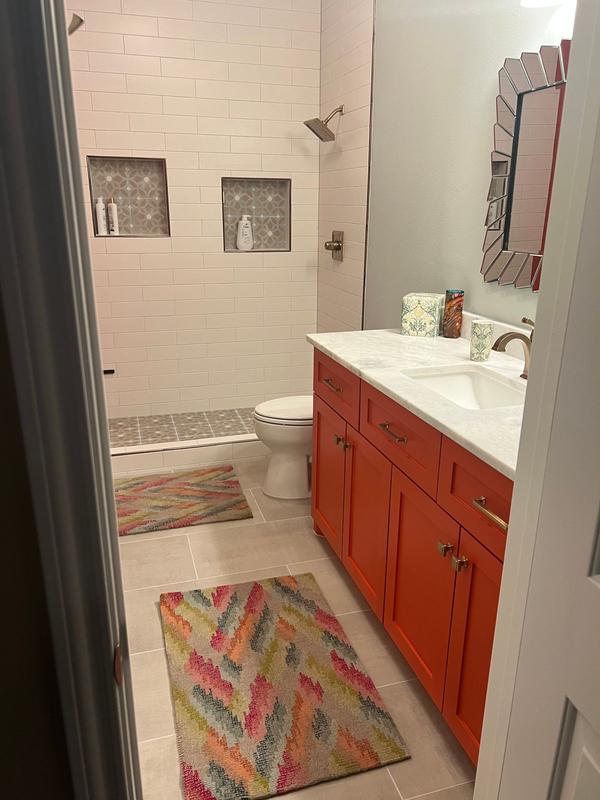 I decided to go bold and vibrant with cabinetry to recent spare bath renovation. This rug with a perfect match for orange cabinetry and sea salt wall color.