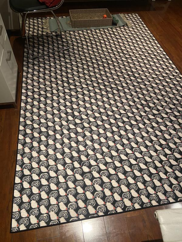 Saw this rug and had to have it. It came quickly and arrived in good shape. The pattern is very bright and makes everyone in our house very happy. We love chickens.