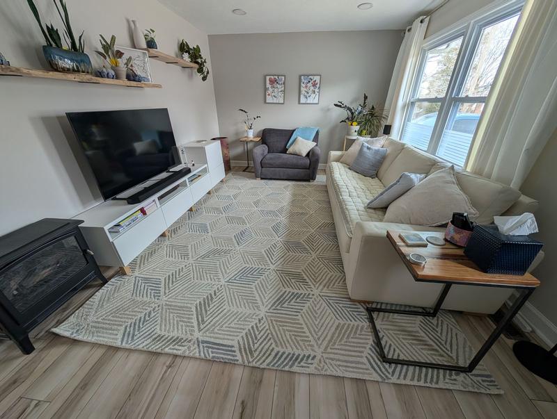 The colors in the stock photos look much more grey than the rug actually is so I recommend ordering a swatch to make sure the colors work in your space. The colors are more beige/greige than what the stock photos show. I ordered the blue version in 9x12 size, it shipped very fast and arrived in good condition. There is a slight musty warehouse smell to it that is dissipating as the rug airs out.I really love the pattern and colors of this rug in my space. The fibers are soft and it seems like this rug will hold up well. Since it is a wool rug, it does require slightly different care especially when it comes to vacuuming. You shouldn't use a standard carpet vacuum with a beater bar or you will snag this type of rug. There has been minimal shedding using my canister vacuum without a beater bar.
