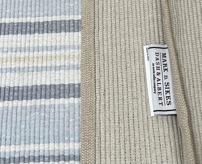 I've included a photo the blue rug is an Annie Selke rug I've had in my kitchen for 8+ years the wheat color rug is this La Mirada rug. Notice the cross stitches on the new rug is a thick cotton that is not comfortable to stand on compared to the old rug which is very soft and much better quality. I don't thinks this new rug will hold up nearly as long due to the spacing of the weave and much courser yarn used. Not nearly the quality these used to be! p.s.system wouldn't allow me to add picture