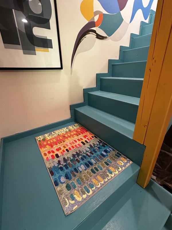 We love our “Paint Chip” rug. The rug is vibrant and makes our dining room fun and inviting. The size we purchased will not fit in our washer, so we would have to take it somewhere or just spot clean which shouldn’t be a problem if we need to.If you want a different, cheery rug instead of all the drab and dreary ones out there, get this one!