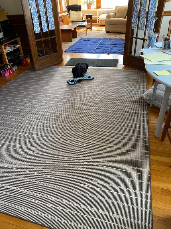 For my dining room, a high traffic area, with an older dog, I'm very pleased with this rug. It's soft to the touch, the weave is subtle, the color perfect, and I know I can take it outside and hose it off if there are accidents. I'm really pleased with the rug. Thank you!!!!!