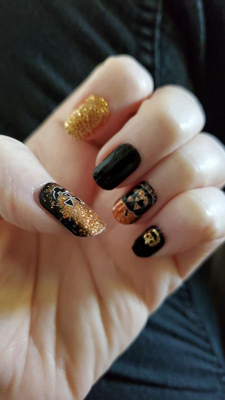 I absolutely love this nail style!! I love anything sparkly!!! These are perfect for Halloween!!! They are so pretty and they last the whole Halloween season!!! They are easy to use and easy to put on!!! Absolutely perfect!