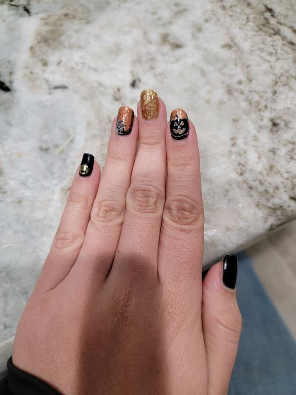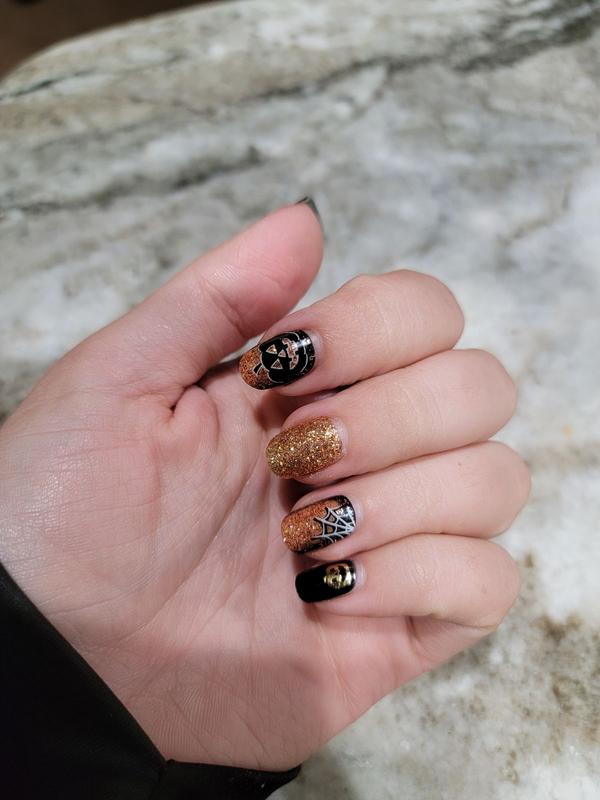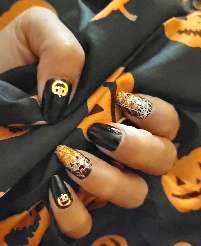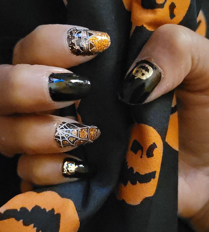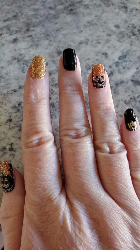 Did my nails for Halloween and they look great!!! First time I ever had black “polish” on my fingernails….love it!!! Mixed with orange glitter and pumpkins - looks sooo festive!!