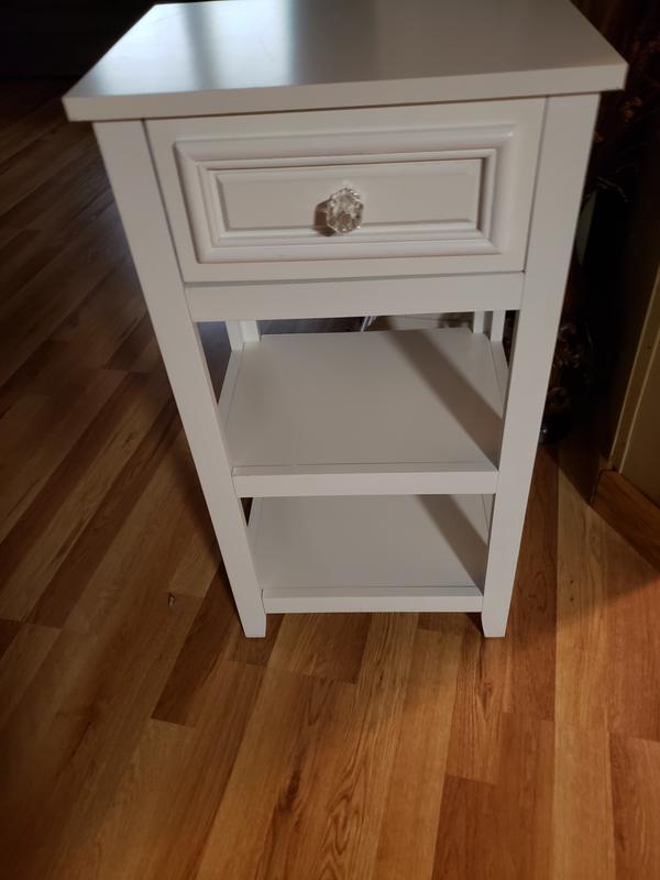 This is so pretty.It arrived packaged perfectly. Came with a instructions and did not take to long at all to put together. Its a beautiful white color Has one drawer with a pretty glass pull knob.Two nice shelves. The shelves are a nice size to hold whatever i choose. Its just a well made sturdy piece of furniture. I am so pleased with it.
