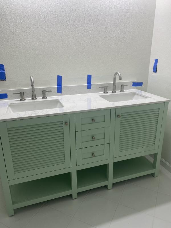 I love the key west design and the quality. The top is a lovely light color with gray tones. It is a nice height for me and I have the mint green color. It adds a lot of color to my white bathroom. I highly recommend this company and the vanity.