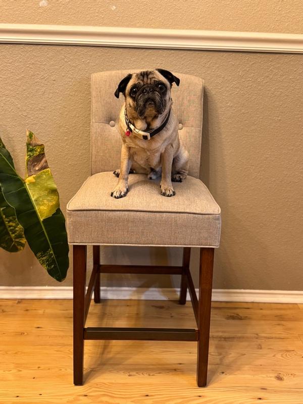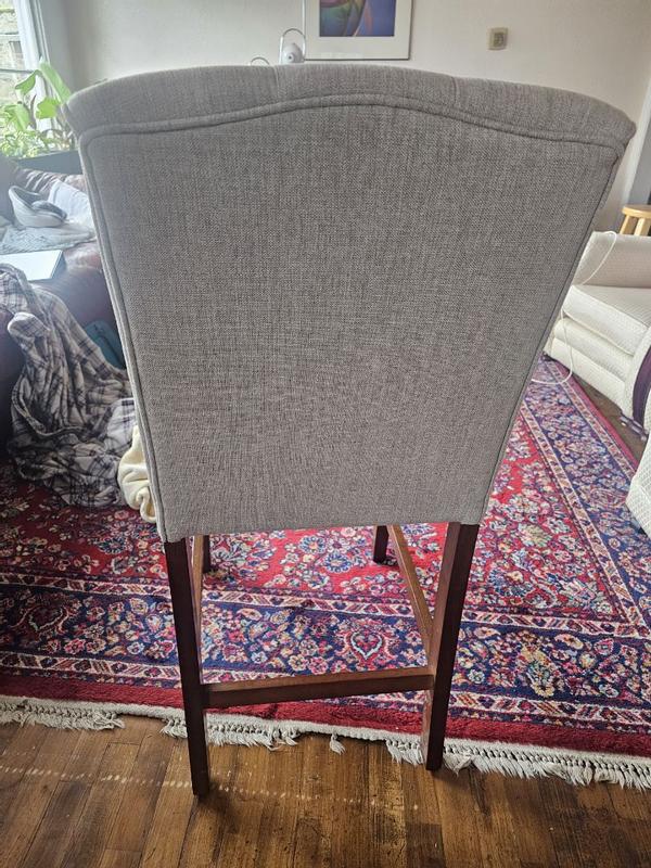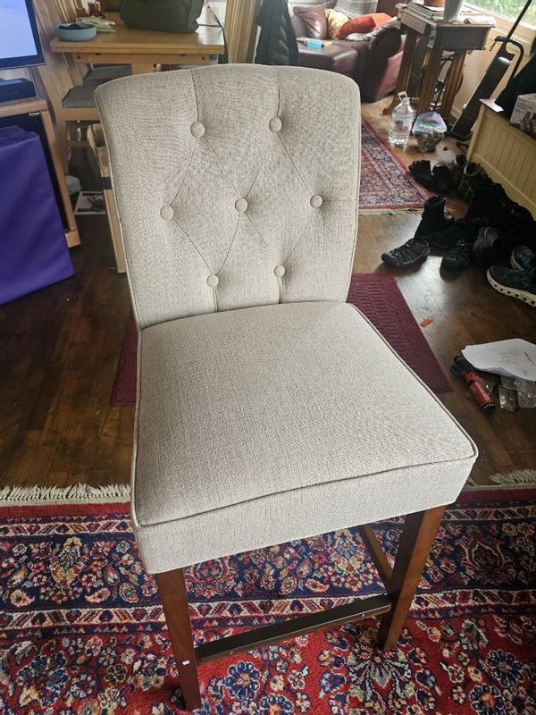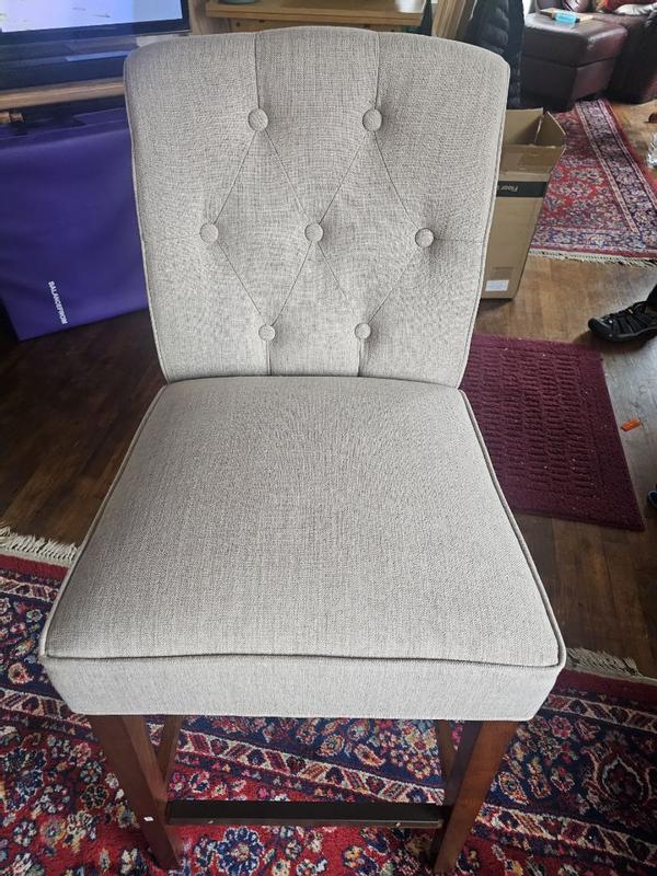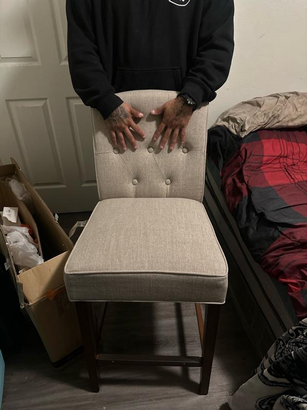 Thank you for sharing your thoughts on our counter stool! We’re delighted that you find the stool comfortable and appreciate its beautiful design. With its chic dimensions of 19.5"W x 24.25"D x 40"H, this counter stool is thoughtfully crafted to elevate your space while offering maximum comfort. The high-density foam, elegant button-tufted back, and sophisticated tan upholstery are paired with an espresso wood finish on the solid wood legs to create a truly refined and timeless look. We understand that assembly can sometimes take extra effort, but we believe the detailed instructions and tools could help you through the process. Your feedback is important to us, and we’ll share it with our team as we continuously strive to enhance the experience of our customers. If you have any further questions or need assistance, please don’t hesitate to reach out—we’re here to help