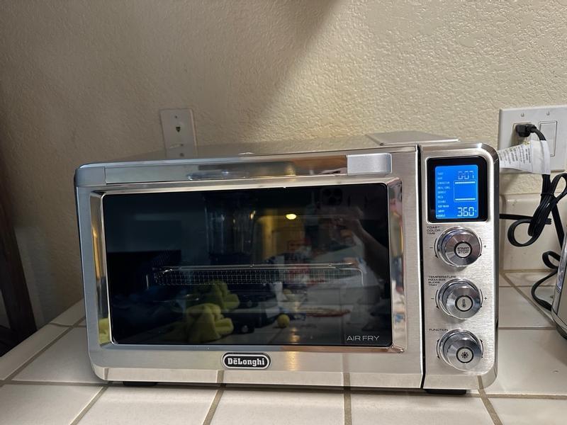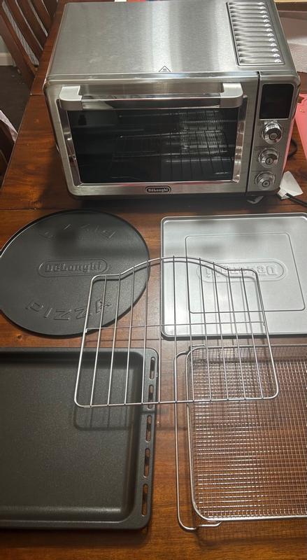 The DeLonghi Air Fry Oven is a great addition to your kitchen appliances. The oven features many settings that can be customized to the type and amount of food you are cooking. Setting include bake, convection, air fry, toast, and many more. It comes with a cooking rack, baking pan, pizza pan, and frying basket.The interior is designed to adequate accommodate a pizza and is notched out to fit its curvature, including the oven rack. The overall size does take up a lot of counter space and the interior is pretty adequate for many items. No more waiting on the standard oven to heat up because this will take care of cooking a variety of items in less time. It makes great fries, toast, baked chicken, frozen items, cookies, and much more. It has some other safety features such as the wall spacers on the back of the unit and a heavier gauge grounded cord. I do think the door for design could be a little better as it catches a lot of crumbs in its crevices and it is hard to get them off. I am excited to cook many more items and see the results it yields. Overall, this has been a great appliance and has been benefical with preparing meals for the family.