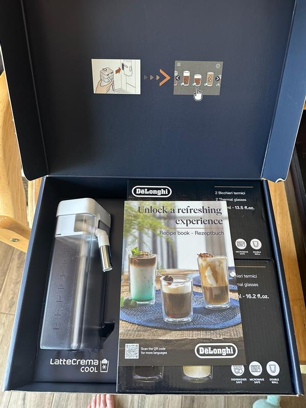 This DeLonghi lattecream cool set is honestly so easy to use. I love how it froths the milk nicely and make it give a nice thick texture. It comes with pretty stable glasses, small and big and is easy to clean as well. I will say it is a bit overpriced but overall it is a good product.