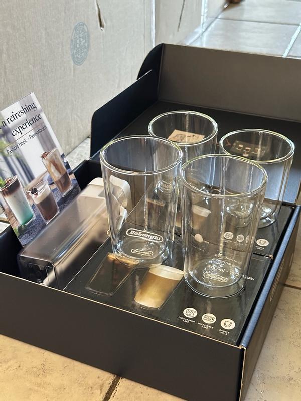 This accessory kit transforms your De’Longhi Rivelia enabling six new cold foam drink options at the push of a button. The machine guides you through each drink, even instructing how many ice cubes to add which is a nice touch! The thermal glasses keep your drinks refreshingly cold and free of condensation. Prompts cleaning cycles and supports dishwasher use!