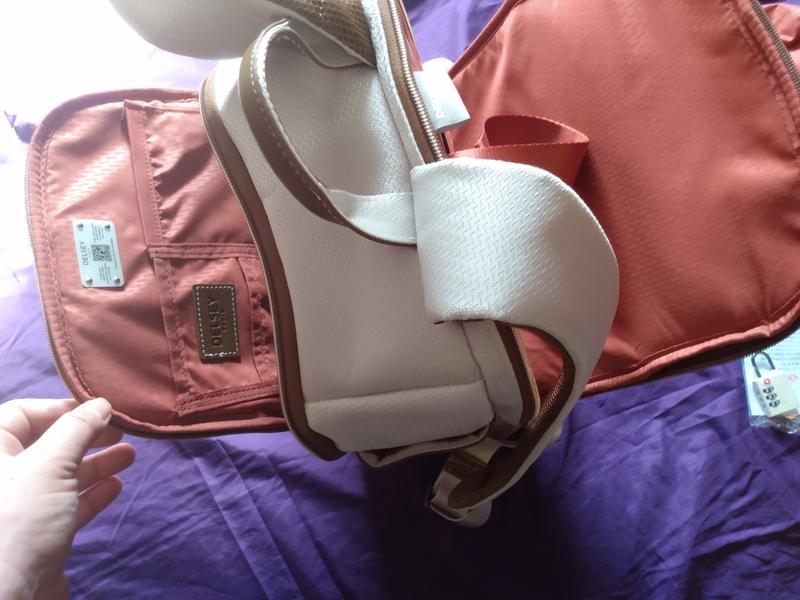 I love this bag!! It is the perfect size for me and fits perfectly under the seat on an airplane!! It's even easy to gets things out when flying. What I don't like is that the side pockets are not large enough for water bottles. However, the thing I have a huge problem with is the fact that this bag does not have the sleeves to fit over the suitcase handle. Even if I have only one piece of luggage and this bag, I am forced to wear it on my back instead of hooking it on my luggage! This can be a pain! Other than that it's perfect!! I LOVE my other Delsey products!!