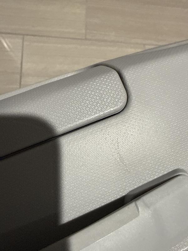 The suitcase is defective with sharp, scratch-like lines and a stretched, misshapen upperside, and the exterior thread stitching is exposed, making it unsuitable for a new check-in bag