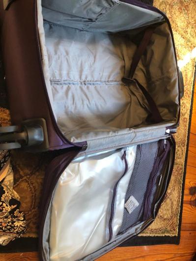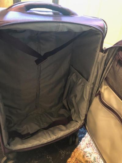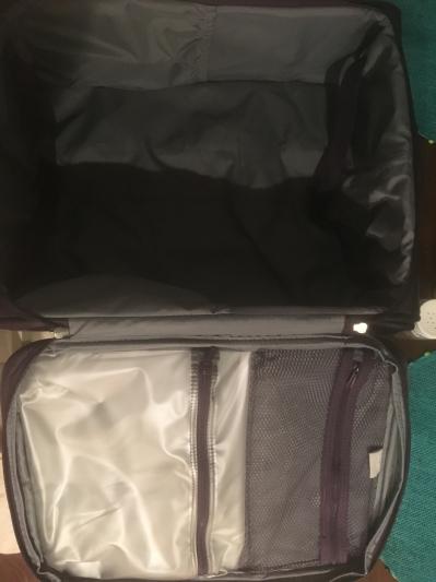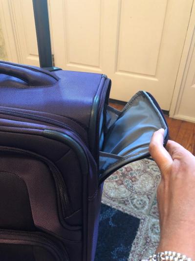 I bought this onein purple and the 24" and I'm glad I ended up checking in the 24" than trying to pass this one off as a carryon because it won't fit in a Trans Canada-US overhead bin especially if you end up expanding it. I'm glad I bought this purple one during a super sale because other than for roadtrips or international flights, I'm not comfortable that this would actually pass the test for the carryon bins. The lining to the inner flap pockets backs to the lining of the exterior flap pockets so beware of packing sharp-edged things as the lining seems delicate. Zippers run from the right to the left so flap opens to the left. When the purple luggage gets wet from the rain, you can tell. I would still give 3 stars because: i like that it has a side compartment that actually could fit a water bottle; glides easily although expandable handle jiggles; its expandable; like the built-in/sewn-on handles.