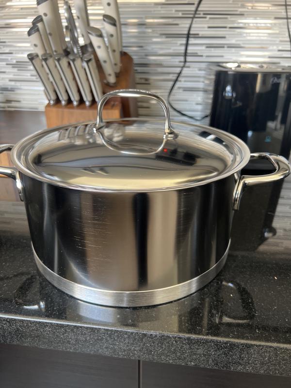 Love the Atlantis cookware line. Made in Belgium, with handles that are welded instead of riveted on. Seven layers with a silver and cooper core, helps with quick even heating. The steel is treated with Silvinox which helps keep the pans looking brand new and resists fingerprints. The handle has a V at the base, which keeps the handle from getting hot on top of the stove. Also oven safe, and induction compatible. The flat stable bottom prevents oils from pooling and will not warp. Great features and good solid pans.