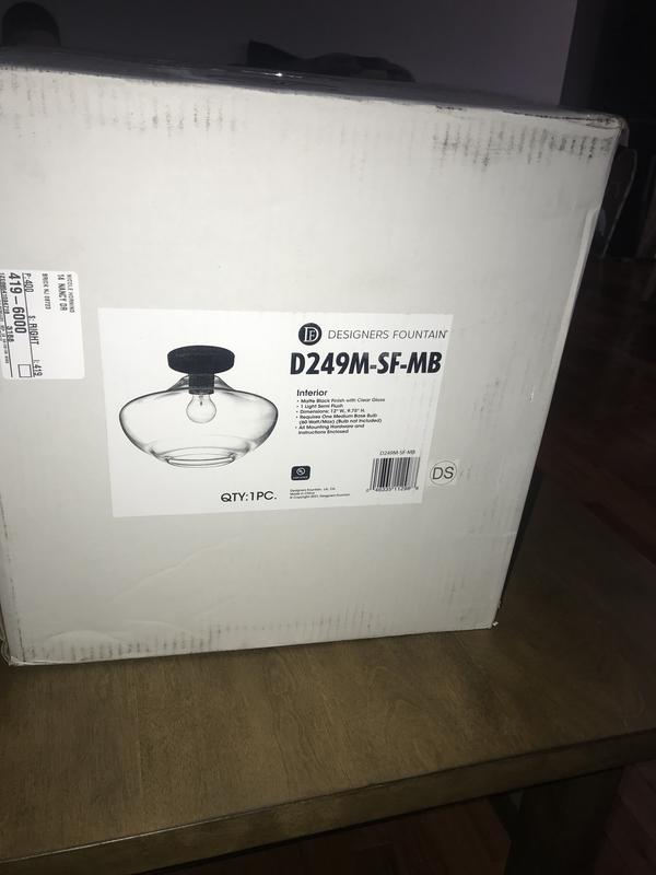 This designer fountain semi flush light is perfection. Perfect look and finish to go with our farmhouse / industrial look. The glass is clear allowing more light to shine through. I did get an electrician to install but he said it was super easy. It uses a medium base 60 watt bulb. All the mounting hardware is included. The finish is matte black and wonderful. I love the size of it and just so much light .it's semi flush. I installed it in my kitchen and it works perfectly there. The design is very clean and sleek. I love this light. Would look good In an old or new home..Great value and superb quality.