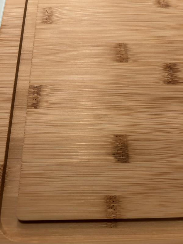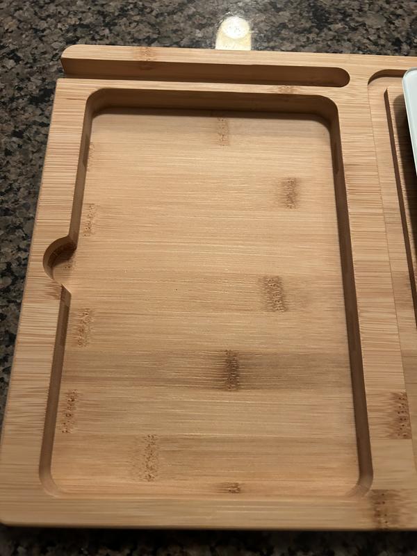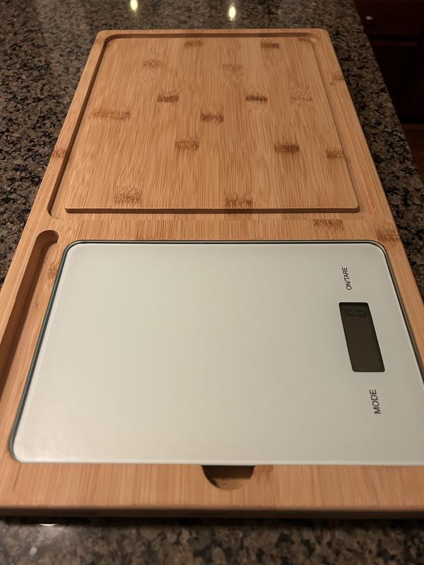 Very nice cutting board, perfect size for prepping meals in the kitchen. I like that it has the food scale next to it for easier measurements, and a slot for the tablet for viewing recepies. I would suggest the tablet to be a little thicker, otherwise it won’t stand in the slot. Also I love that it has the slots on the side so the juices get collected there instead of dripping on the kitchen counter. I would definitely recommend 10/10. The bamboo material also a big plus as I’m trying to avoid plastic