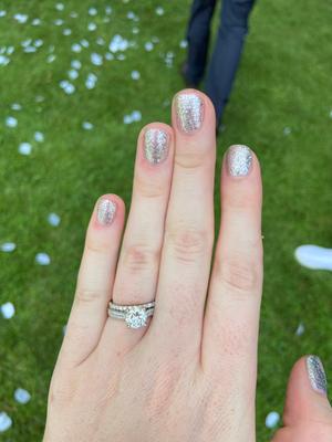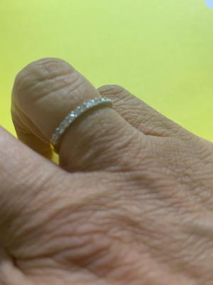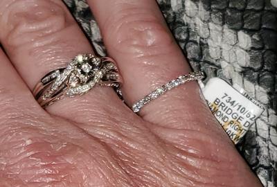 I bought this to compliment my wedding ring I have now that has two diamonds in it, I did not want anything big so I thought this would be perfect. Unfortunately when I opened it upon receipt I was very disappointed, you could barely see the diamonds and it looked like a band with sparkles.