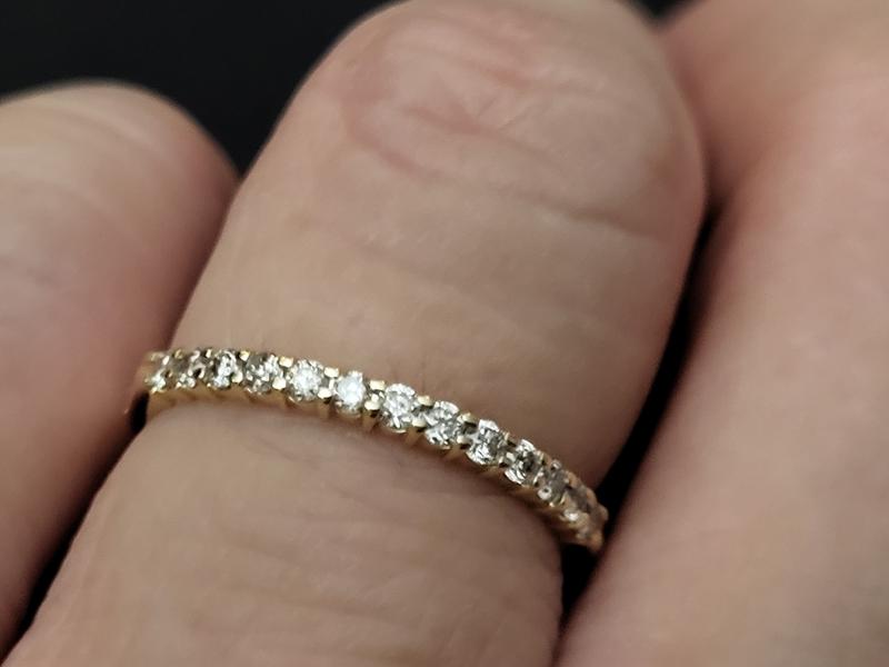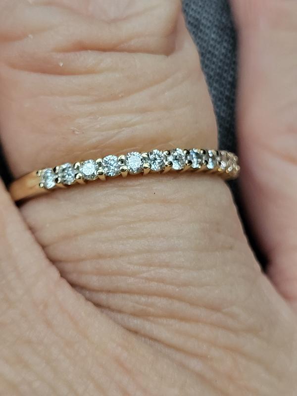 This ring is absolutely gorgeous, I initially purchased just one to stack with other rings I have. However, I ended up ordering two more bc of how much sparkle given the smaller karat weight it still stands out.