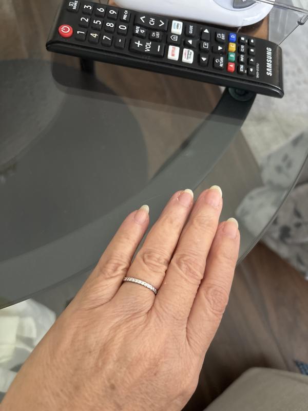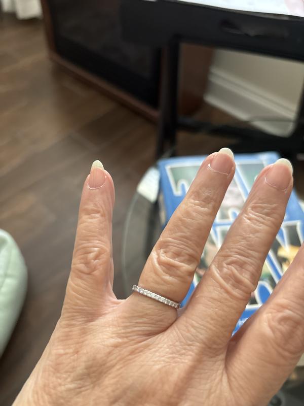 It’s very fine and light so it’s very comfortable on my ring finger. I don’t even know I’m wearing it which is what I love about it. I can keep it on all the time. Beautiful sparkle to it. Highly recommend.