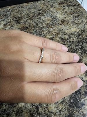 I had been looking for a ring to wear as a wedding band when I’m not wearing my wedding set and this ring did not disappoint. The rose gold is a nice pink color and the diamonds have a nice sparkle. I’ve gotten so many compliments on it. As someone did mention it is a delicate ring so it does feel a little thin and doesn’t have too much weight to it, but it was just what I was looking for. I looked at other rings with in a similar style and Macys by far had the best price.