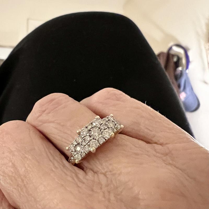 It's Beautiful and My Husband knows how to choose what looks great on me. Had to get it resized twice which took about 2 weeks total. It's shines and glistens and looks great.
