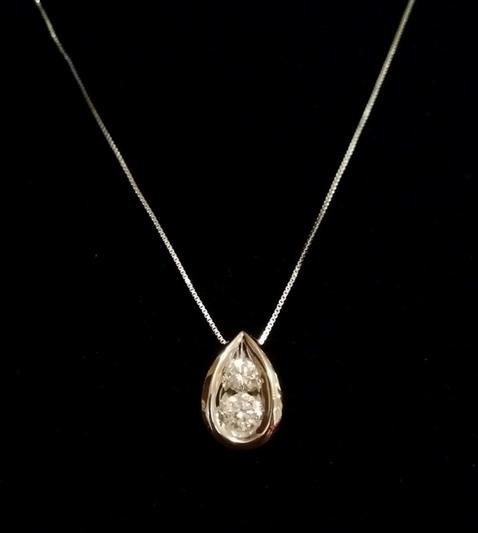 This pendant is an example of a timeless classic. The diamonds are actually clean-looking, bright and very sparkly. The shiny white gold surrounding the diamonds really compliments the overall clean and sleek look of such a rich design. The only flaw I see in this necklace would be the box chain it comes in. Even for my petite body structure, I feel the 16" chain is just too short. The pendant falls right below my collar bone area. I would much rather have it in 17".