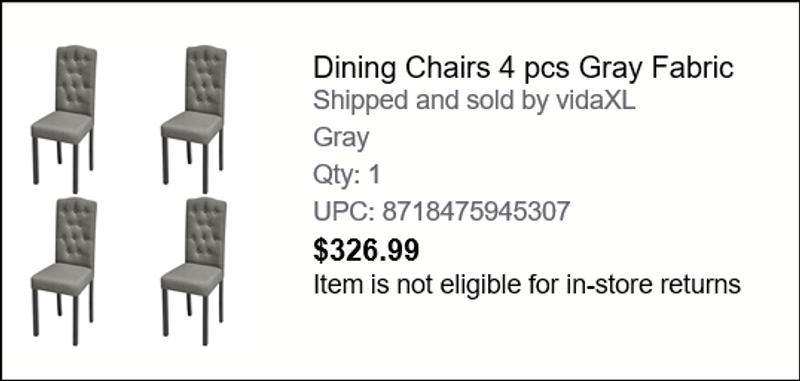 I gave a one star rating because a zero star rating wasn't an option. This purchase has been a complete nightmare! I ordered 4 dining chairs in gray fabric. I received 4 seats and only 2 backs, one was white, one was brown, they were a fake leather material not fabric. I have tried to work with the supplier/manufacturer and they have said the item is correct. How can they feel good about that reply?!