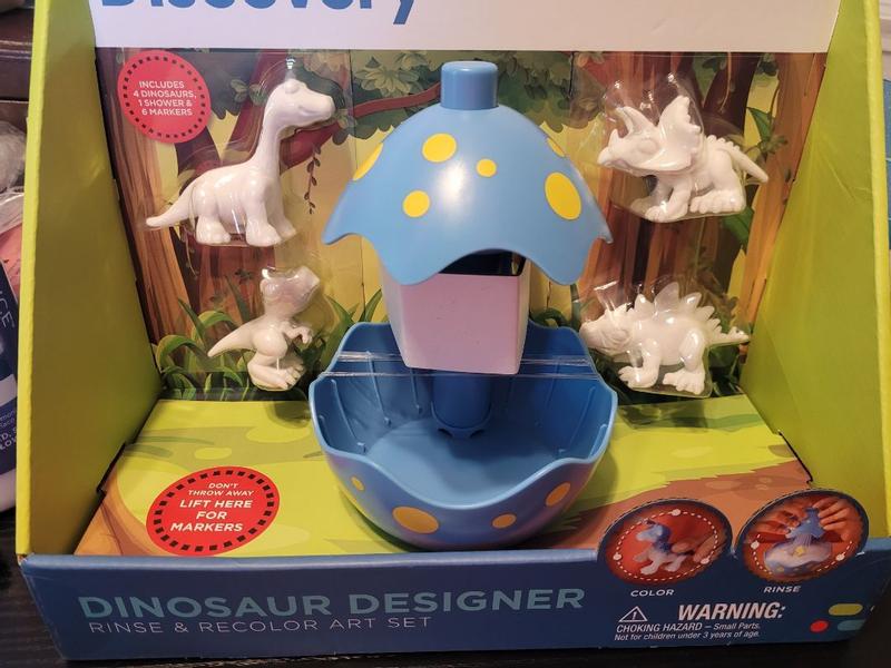 What a fun toy. You can color in the dinosaurs and they give 6 markers and a stencil for the details. After you can use the egg to shower and wash them off and do it all over again. The only recommendation i have is to make the dinosaurs bigger.