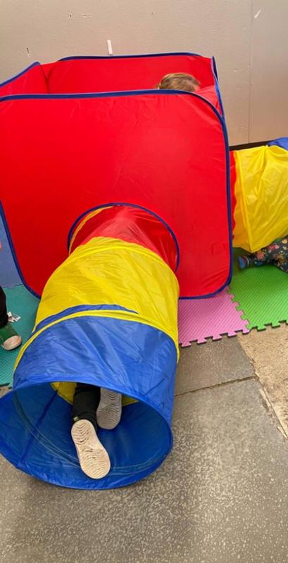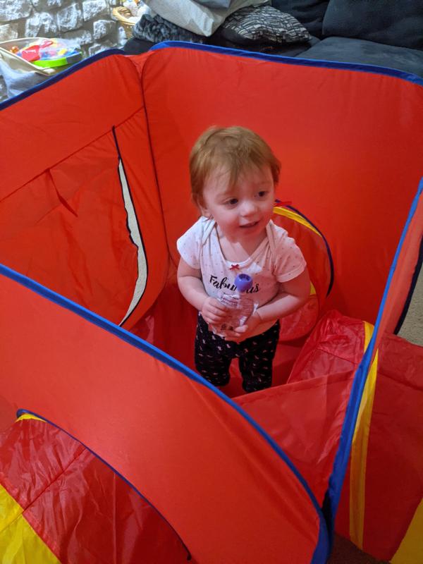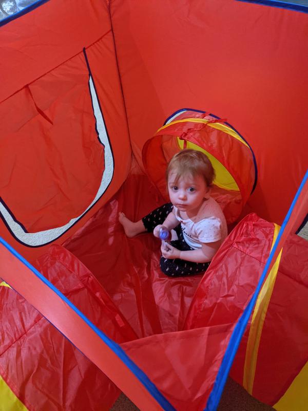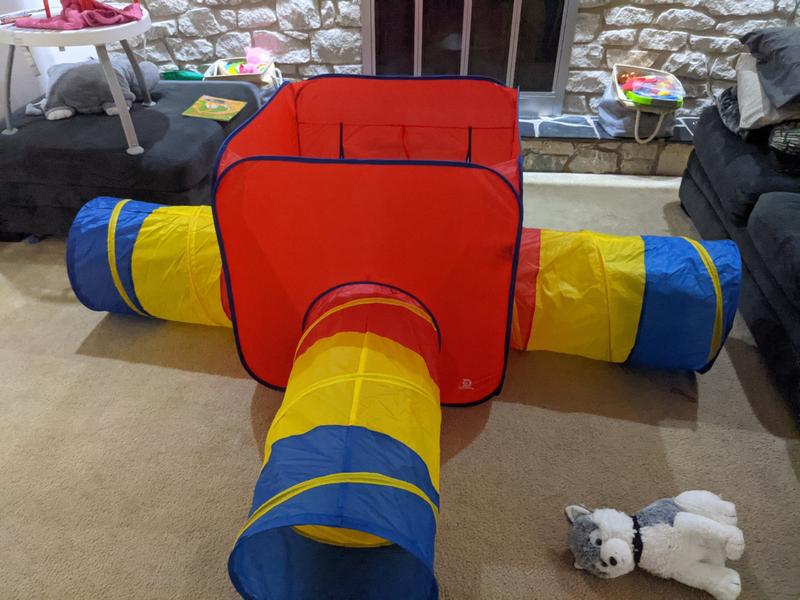 I really love how easy this is to fold up to take practically anywhere with space- it's very easy to assemble and with a little practice it gets easier to fold it back up to fit in the zipper pouch. My only complaint is that the nylon ties that attach the tunnels to the tent are very thin and feel cheap. My nephews love to play and it was scooting around and pulling. If they keep playing with it together these ties are bound to break off. But, it's bright and perfect for active kids who love to play.
