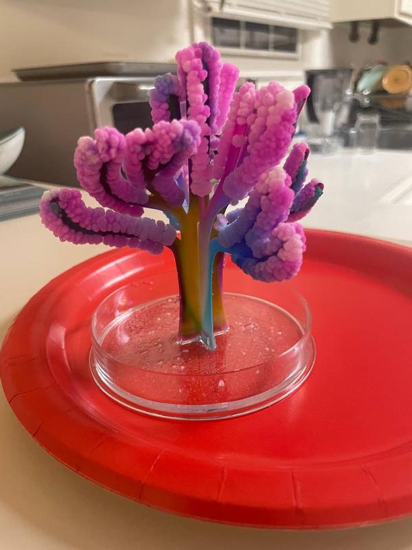 This kit is not only fun, but educational in the science arena. My boys loved creating the beautiful tree of color. They simply colored in the provided tree-like cutout, poured the solution over it and voila… soft puffs of color started growing in about 30 minutes. Several hours later, it was full and beautiful. It doesn’t grow hard crystals, it is more like a soft, puffy material. The kids were in awe of their creations. I love to give them activities like this. Highly recommended!