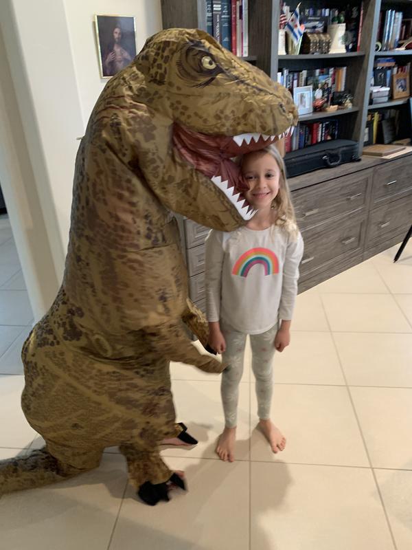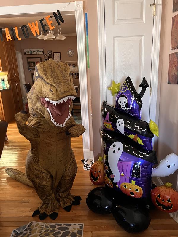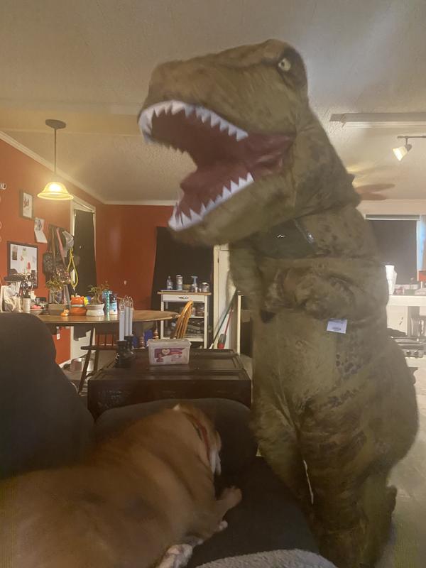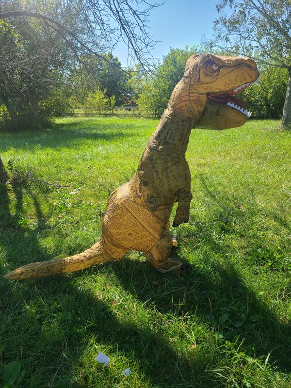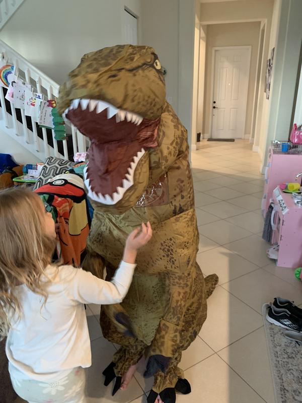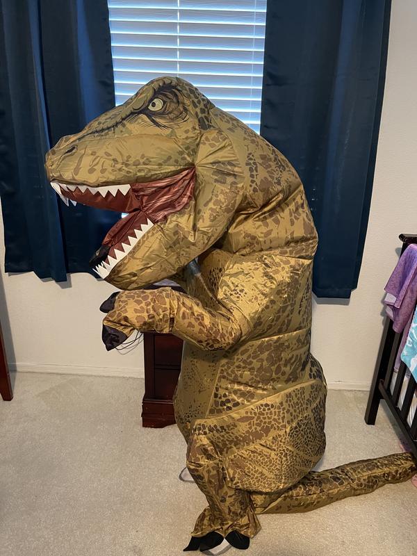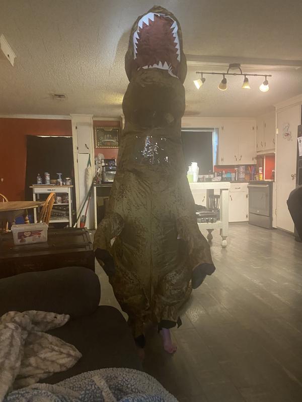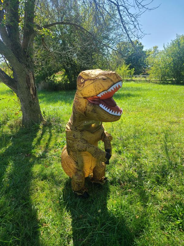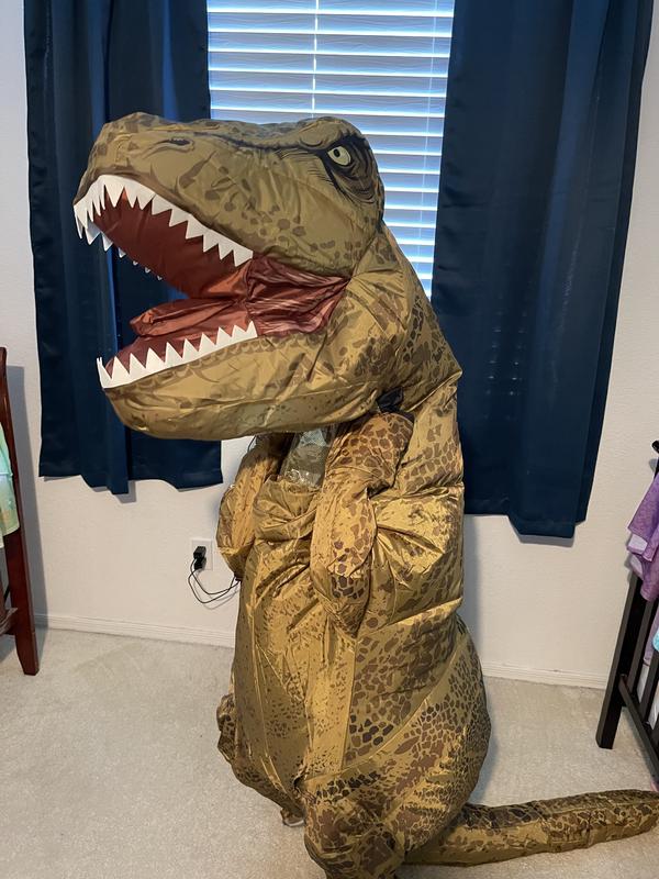 My son loves this style of costume, so he was super excited to try on another inflatable. We loved the look and fit of this one. The little window did steam up a bit, so keep that in mind if it’s warm where you are trick or treating. The size was great vertically and horizontally, but the arms were a bit short. I know, I know, it IS a T-Rex… The fan inside works great, the effect is epically funny, and it made us all laugh. We will have a lot of fun with it this year.