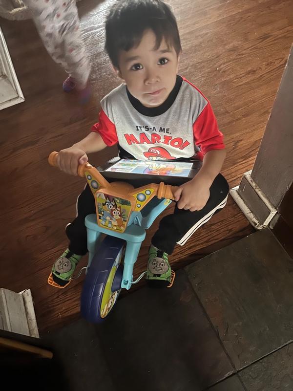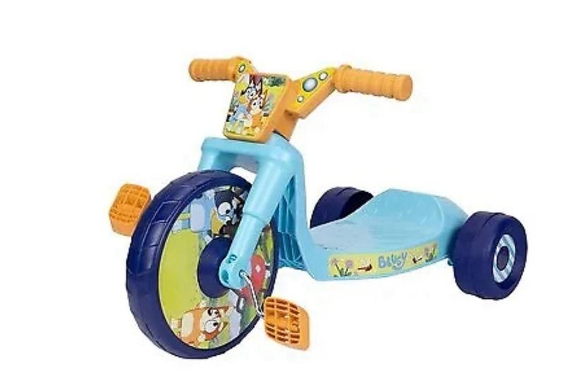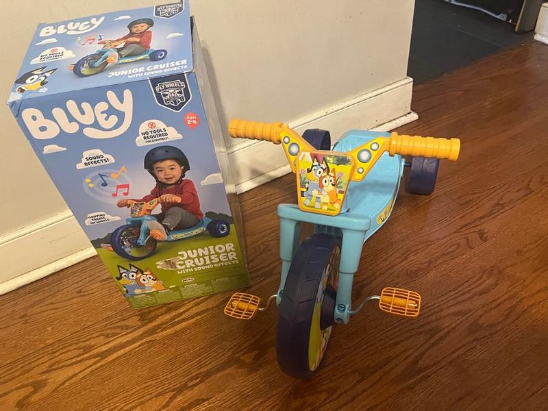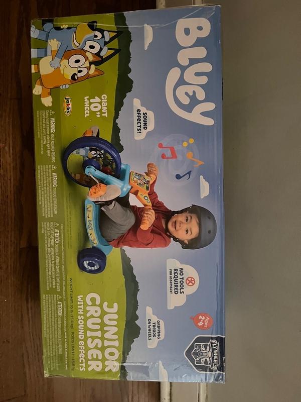 It's time to cruise around with this Bluey Fly Wheels Junior Cruiser. Featuring an extra-wide front wheel, it's designed for stability and maximum control for toddlers. The Junior Cruiser also includes mega grip tread on wheels for awesome street gripping action, and push buttons on the handlebar that will activate cool sound effects. Handlebars are easy to grip and make riding secure and safe.