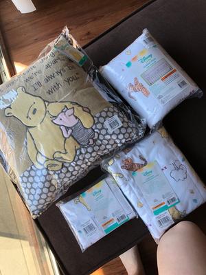 The Winnie the Pooh design is nice. Everything else about the sheets is not nice. First, they don't fit a standard size crib very well. I felt like I was in a wrestling match with the mattress every time I had to put these sheets on. They are too small. But the worst part is that these sheets left my little granddaughter's face red. They are scratchy and not a soft smooth cotton you'd expect in a crib sheet. I bought two of these and ended up throwing them in the trash because I didn't even want to give them to Goodwill. They are very expensive and not soft enough for the tender skin of a baby.