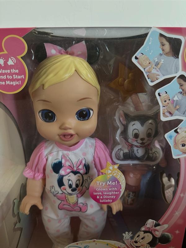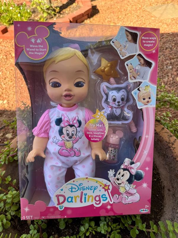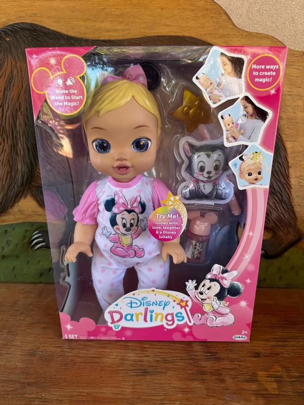 My daughter loves playing with the Disney Darlings Minnie Mouse doll. She looks so adorable. This joyful 13-inch baby comes to life with twinkling, starry cheeks, infectious giggles, and a sweet lullaby.
