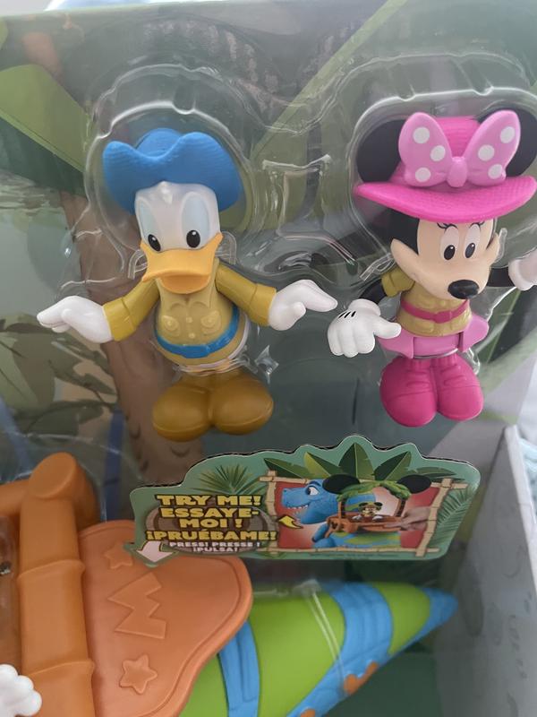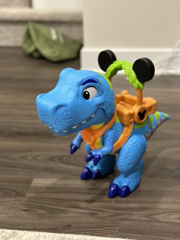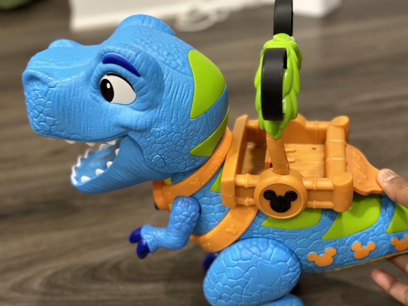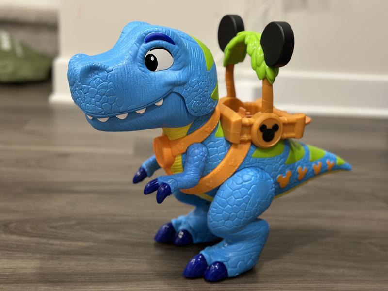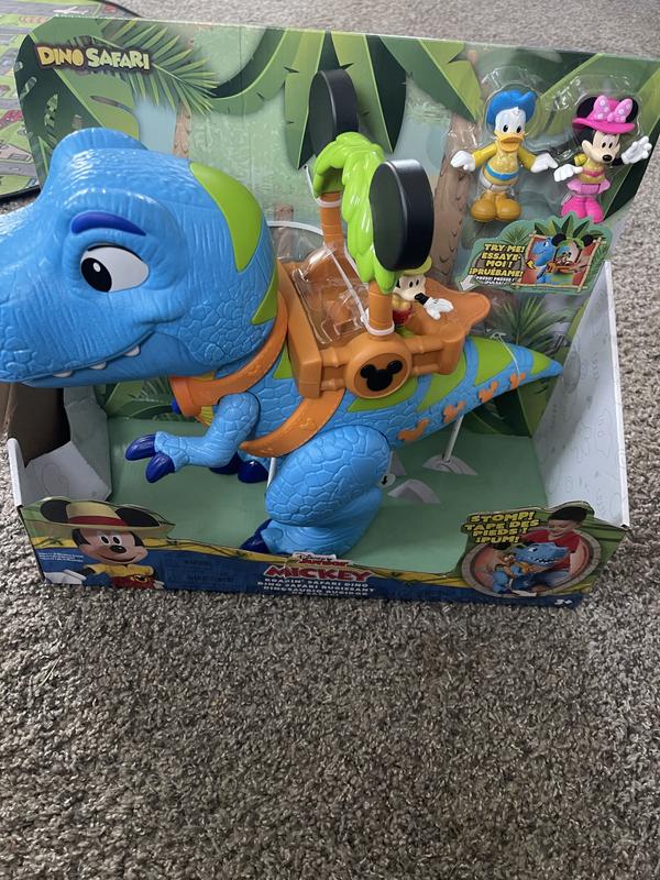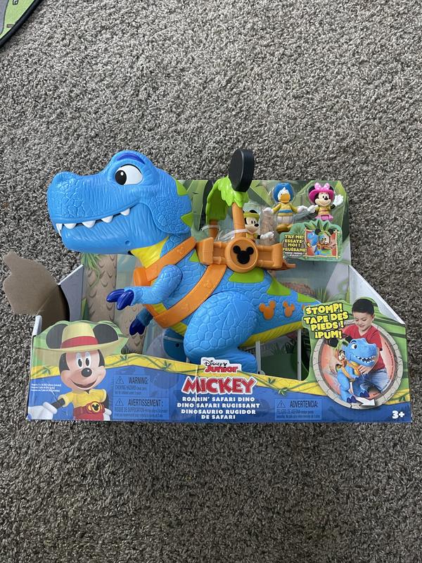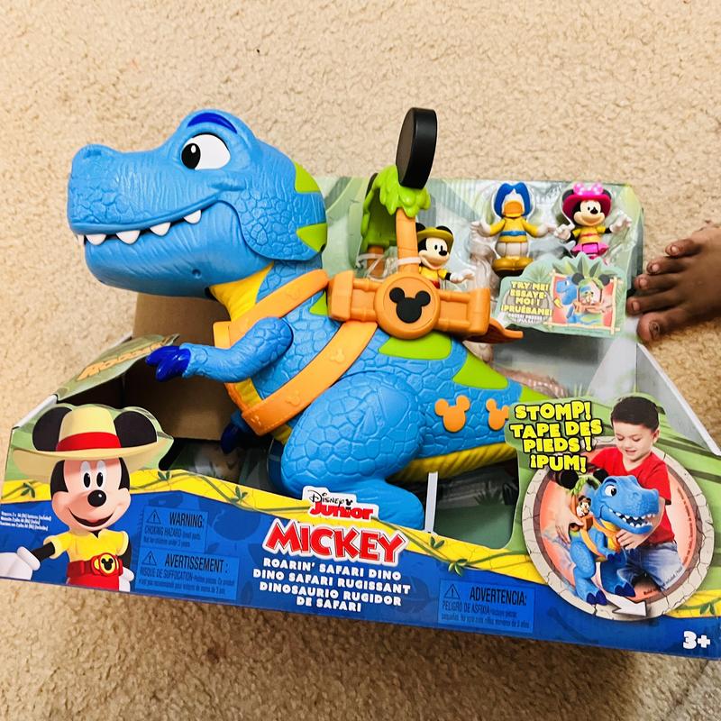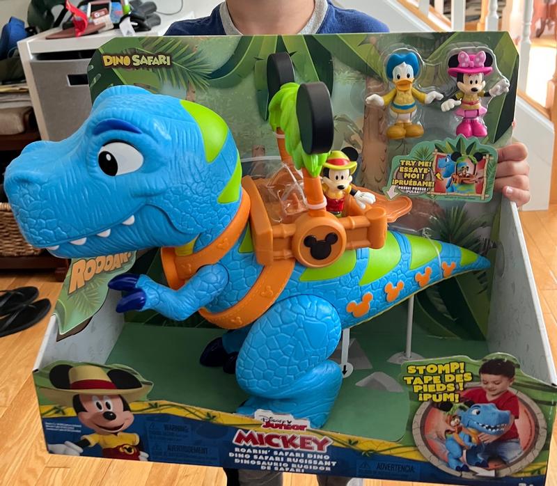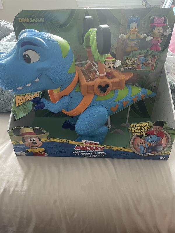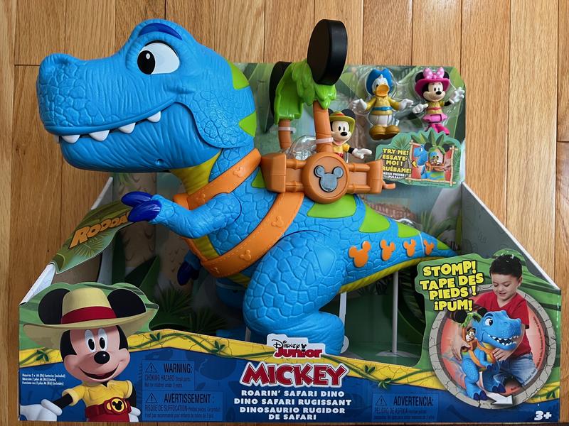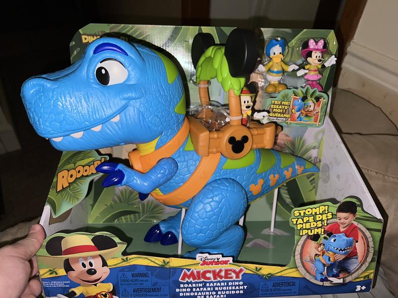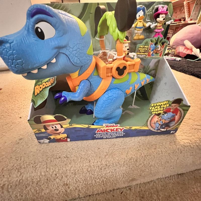 this Mickey Mouse Giant Roarin' Dino is a great toy for play time. The dino itself is large and impressive at about 16" Tall. Dino has a bunch of functions activated by the lever on it's back to make it open and close it's jaws, roar and talk. If you full the tail it will stop it's feet with sound effects as well. Also comes with 3 inch poseable Mickey, Minnie and Donald figures as well. Overall well made and tons of play activity available