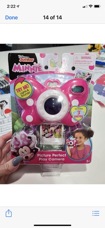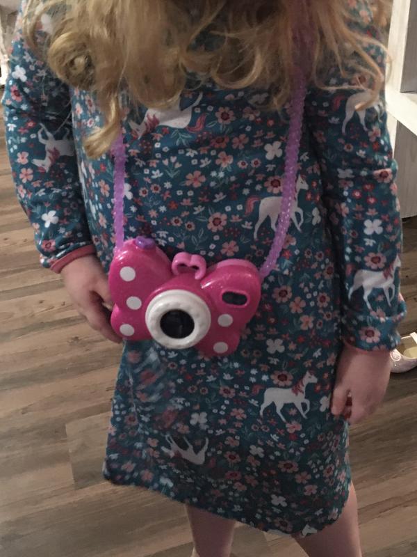 Got this for my niece for her birthday and she just loves it! Lights up and makes sound when they press the button and minnie says smile for the camera. Perfect size for little hands. Also has the necklace that lets them hang it from their necks!