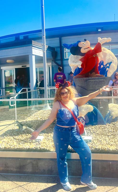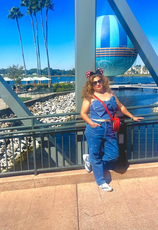 I purchased the Demin Minnie Mouse Bow embellished with crystals by Swarovski. It fits perfect on the bodice and it has straps that allow you to adjust the fit of the top and there is extra material of the side of the top that stretches. Three features, I really love the big bow in the front of the with the images of Mickey Mouse Embellished with the Swarovski crystal all round the top of the bow. The back has a beautiful added feature a Mickey Mouse embellished zipper adjuster which handle the movement of the zipper. The top is mid drift but it fits nicely. I love my purchase it made me feel chic, pretty and felt comfortable.