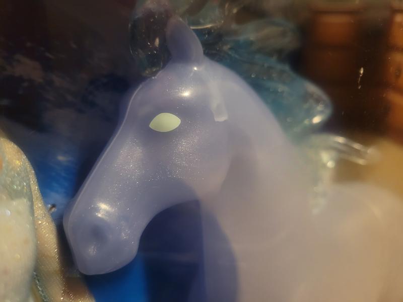 This set is awesome! My daughter is crazy about horses, which is why it caught my attention. The horse is so beautiful, its mane and tail are see through blue and look like waves of water. The saddle has a bracket that snaps around the dolls waist to hold her on. It’s great if she has to go on a wild ride!