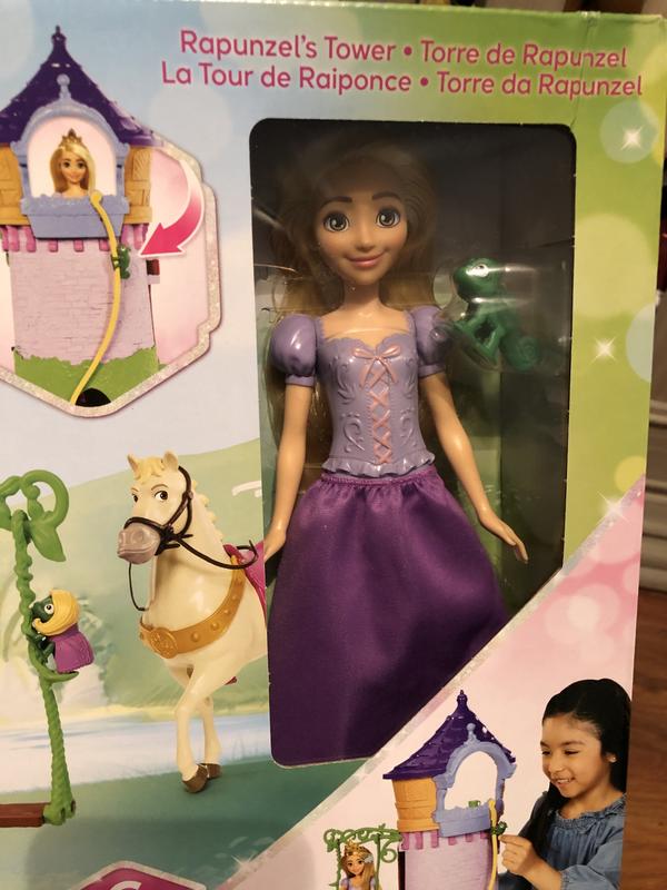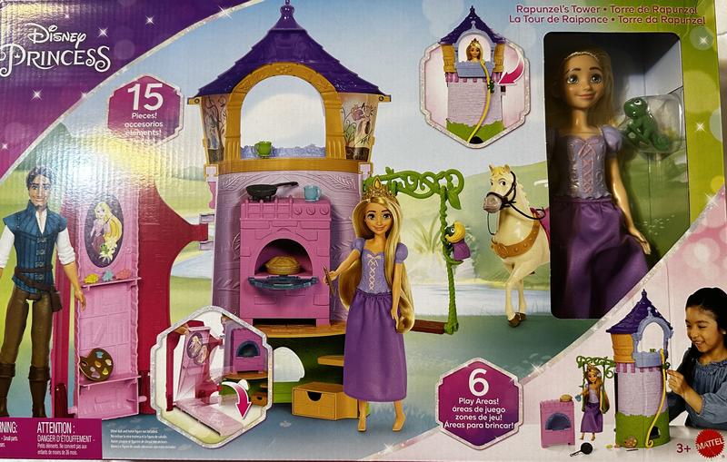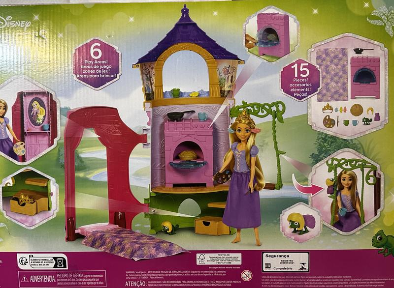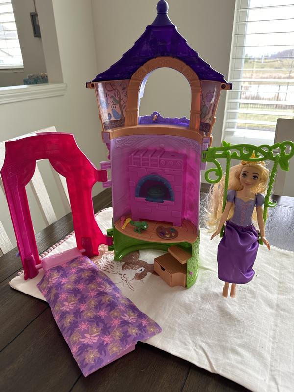 Adventure awaits Disney Princess fans with this exciting Rapunzel tower. Kids will love exploring this fun playset inspired by Disney's Tangled. Tower includes a transforming bedroom, kitchen, dress-up area for Pascal and outdoor swing. Doll cannot stand alone. Colors and decorations may vary.