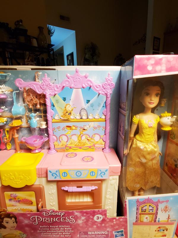 Disney Princess Belle's Royal Kitchen a few weeks ago. This set comes with Princess Belle doll, Mrs Potts and a chip cup. The kitchen set come with lots of accessories. The kitchen set includes 13 accessories. There is a white cake, cake stand, whole pie, muffin tin with muffins inside, chandelier, cup with saucer connected on bottom, 2 pink apples connected together, small cooking pot, soap dispenser, two utensils, spatula and a slotted spoon, a decorative bowl, and a slice of pie on a plate. Belle comes with a removable skirt and pink heels. She also has a pink tiara on her head. She has long soft hair and painted on features. Her arms and legs move up and down, however they do not bend. I do not like her arms. When arms are raised they are to far apart and hands are in a werid upward position. Her shoes are removeable but did not fall off easily. Her skirt is easily removable. Her top is just plastic and painted on her body. The kitchen very well made. It has two sides to play with. The front of kitchen has two doors. One is oven and other is a cabinet. Each door has a self inside them. I found when closed however its very hard to open the doors again. There is not much handle to grip and there is a small piece on inside that snaps to kitchen. The oven does have a window. There is nothing on the oven window. There is a cabinet under oven that does not open. The sinks nice and big and faucet does turn to move in different positions. The stove top is just plastic with 2 stickers. And the stove top controls are also a sticker. On the back there is two small shelfs to hold asserories if you like. This set is very nice and I'm sure any child would love to play with it.