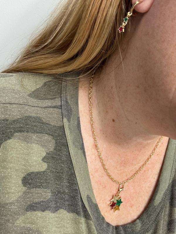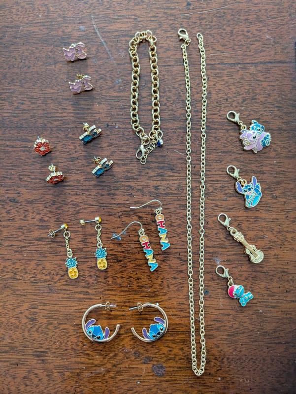 Stitch is super cute on all the jewelry and accessories. The detail on the charms and earrings makes them quality items. The box is super cute and creates anticipation to fit what’s behind each door. I love the length of the chain at a nice 16”. The charms are fun to change between the bracelet and the necklace so I can mix and match. The earrings are easy to put in and look super cute. This set is so wonderfully done it can be worn by an adult. I can’t to find the other sets.