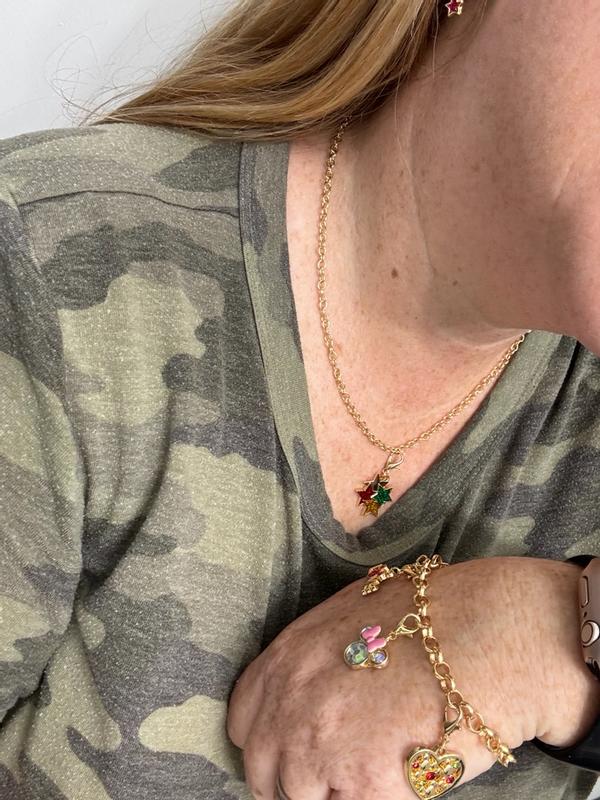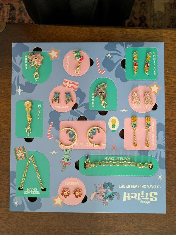 This 12 days of Christmas jewelry set is super cute. I am so happy I picked the stitch one since he is from my childhood and I love that it has accents of pink in it , my absolute favorite color. The packaging is super cute. And the jewelry is beautiful. It had 4 charms , one I used for the necklace and the rest for the bracelet. And 7 pairs of a variety of super cute earrings. Such a lovely set!