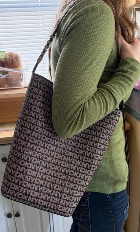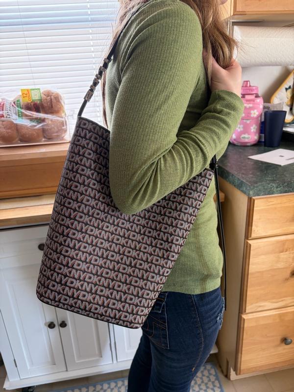 Oh my goodness! I really love this DKNY Avril bucket bag. I received this purse from Influenster in exchange for my honest review. This bag is so sturdy. Stands up when set down and the material on the outside not leather but is tough and feels like will really hold up to the elements and just using it. The snaps close really well and holds but not too hard to open. The DKNY words all over the pattern just gives it that funky vibe yet not too flashy. There are no pockets in this bucket bag but there is a little zip up purse inside that attaches by a hook that can add little things in that want to get quicker without searching the bottom. Plenty of room in that and thevpurse itself. The perfect size for me and I am enjoying using this bag. I would recommend this bag to anyone looking for a unique shape with plenty of room without looking so big. Thank you Influenster for this bag.
