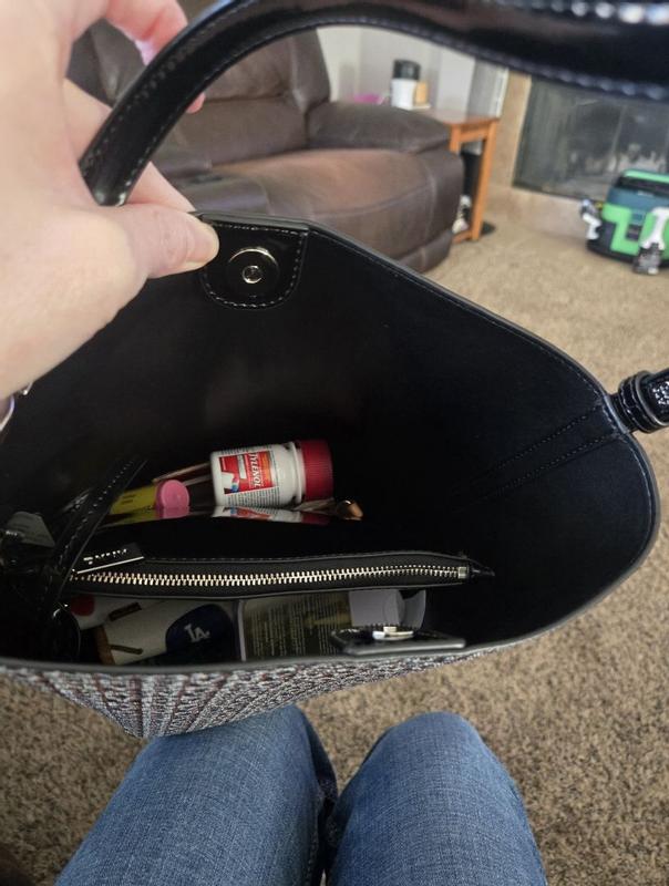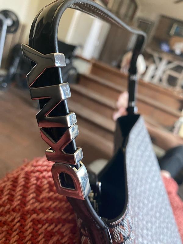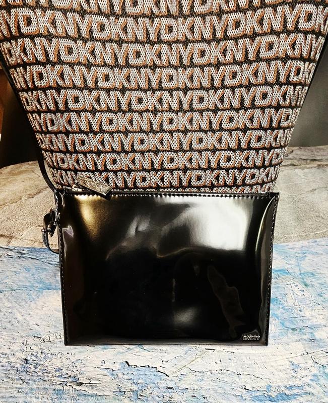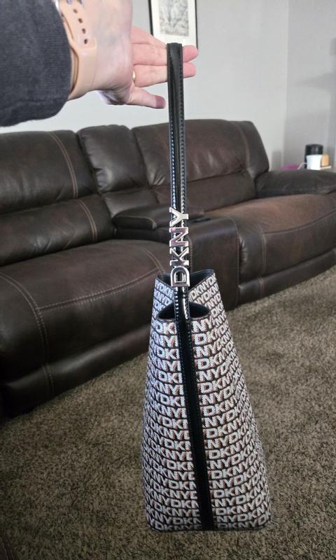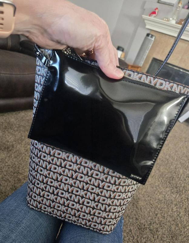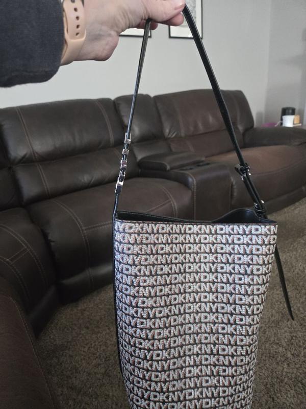 This DKNY Avril Black Bucket Bag is a solid choice for an everyday bag. It has plenty of fun details that can bring it from day to night. The black and gray lettering make stand out, especially with the shiny black patented leather details. It also comes with a detachable mini clutch bag. It can fit all of my things and more. Plus, it stands nice and tall. I love that it's light weight, too I know many would be jealous to not have this handbag on their shelf. It's a fabulous DKNY Handbag!