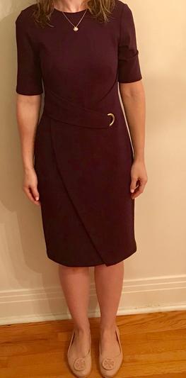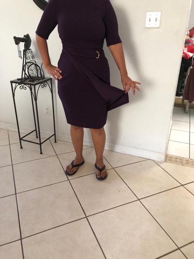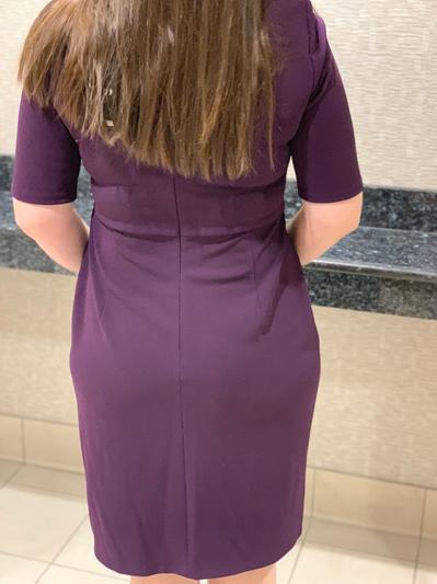 This dress is perfect for quickly dressing and looking pulled together. The drape in the front also helps to hide a a little lower belly bulge. My husband said he loved how it looks and the length is conservative since it hits at the knees. The dress gives off a very polished look and is very comfortable.
