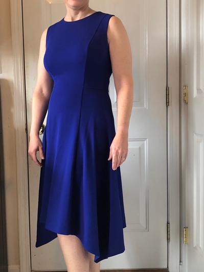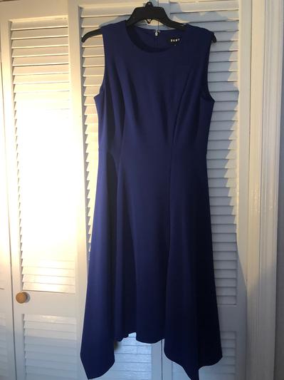 I'm so excited to recommend the DKNY Handkerchief Hem dress as a worthy investment in representing your style, or in developing a style. The handkerchief hem is not at all a frivolous aspect and does not detract from an elegant presentation. This dress fits impeccably and what I love most is the weight of the fabric--it has a weight that makes it hangs on the body flawlessly, and without wrinkles. It really has a well-tailored look. I did receive a free sample of this dress, but that does not influence my review in any way. But, I am a very lucky girl. This dress has become an immediate favorite of mine. And, the color--marine--is stunning. For dinner, or any dressy outing, this is a simply elegant dress that will support your particular style of jewelry--a choker or a long slender necklace; button earrings or ones that hang; hair hanging, a ponytail, or an up-do. Shoes--pumps or sandals. This DKNY dress will represent you as stylish and confident. Really.