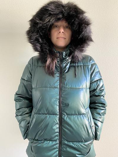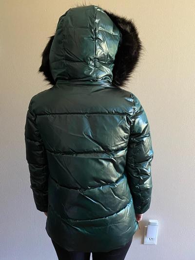 I bought this for my teenage daughter and it looks cute on her. It's stylish with just the right amount of shine in the silver color. She's 5'8" and weighs about 150lbs, so I got the large, which fits pretty well even though she usually wears a medium. The length is good (just past her bum) but the coat itself is a bit bulky and maybe not the best choice to wear for sporting activities like skiing or snowboarding -- it's more of a fashion jacket. Quality is great!