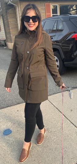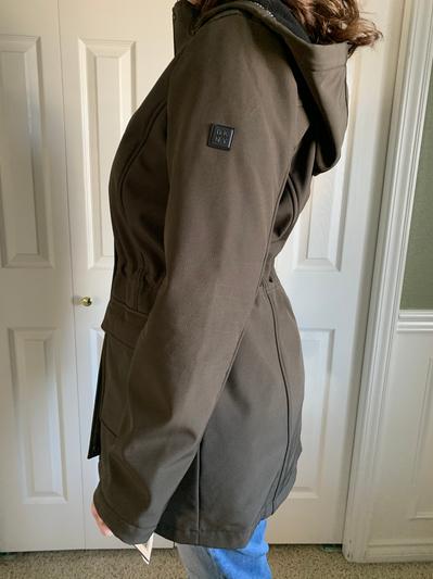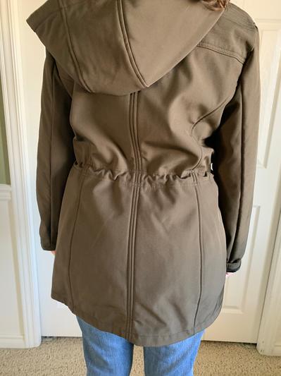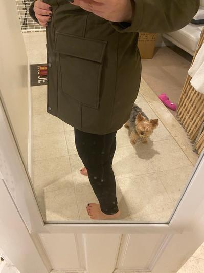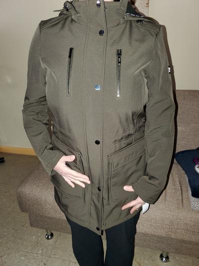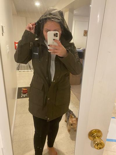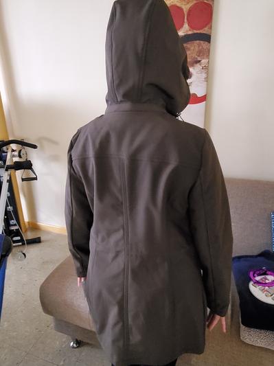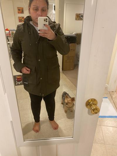 This jacket is great! The length is perfect and it’s comfortable. There is also a drawstring inside the jacket to adjust it according to your waist. It is perfect for all types of weather. The jacket has a hood that you can tighten in the neck area for when it is windy. It is also waterproof for when it rains. It has 2 large pockets in the stomach area and 2 pockets in the chest area with zippers for any valuables. Overall, it is a very practical jacket with a nice look!