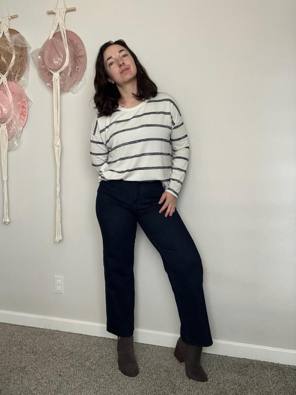 Loved these Jean trousers for business casual office looks! Amazing quality material, thick and soft. Beautiful dark blue color. No band/zipper/buttons create slimming effect and make my belly look so good. However, to keep in mind, these trousers are not stretchy at all and I would recommend to size up for a more polished look!
