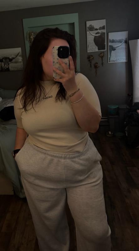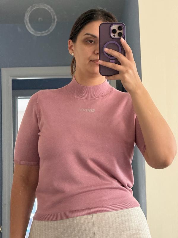 The material of this shirt feels soft and high quality, and the overall fit is flattering and comfortable. However, I personally wouldn’t purchase it for two reasons: the rhinestone logo in the center feels a bit tacky for my taste, and the sleeve length is a little awkwardly. It’s a nice shirt in terms of comfort and fabric, but the style details just weren’t for me.